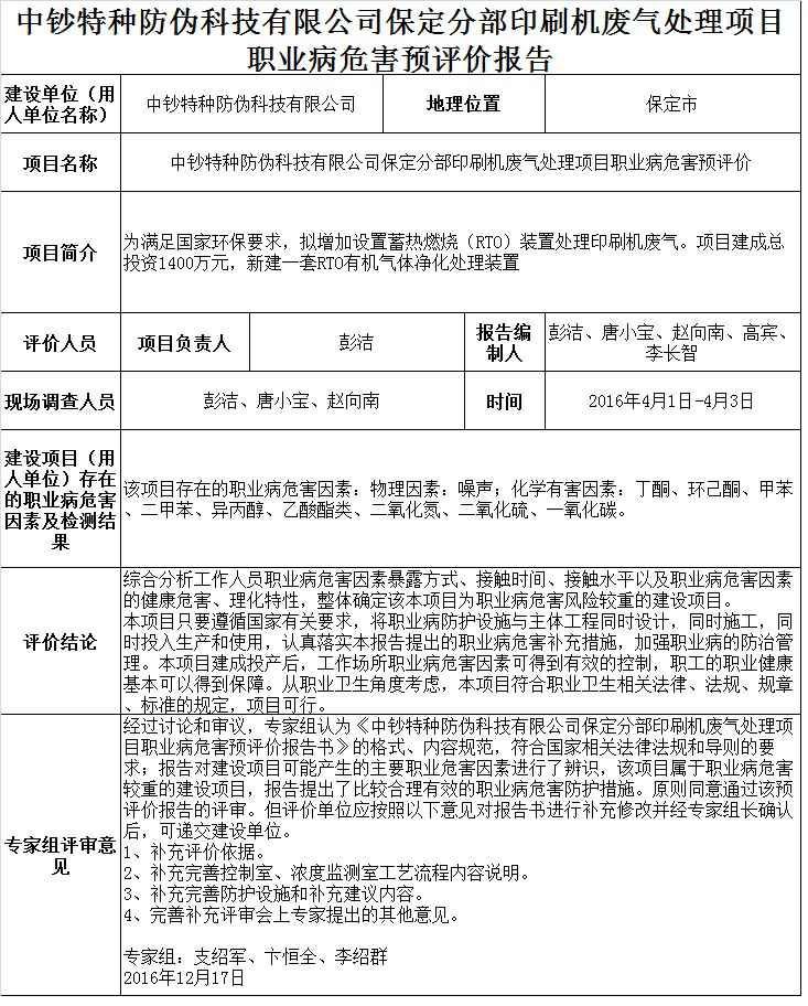 中钞特种防伪科技有限公司保定分部印刷机废气处理项目职业病危害预评价